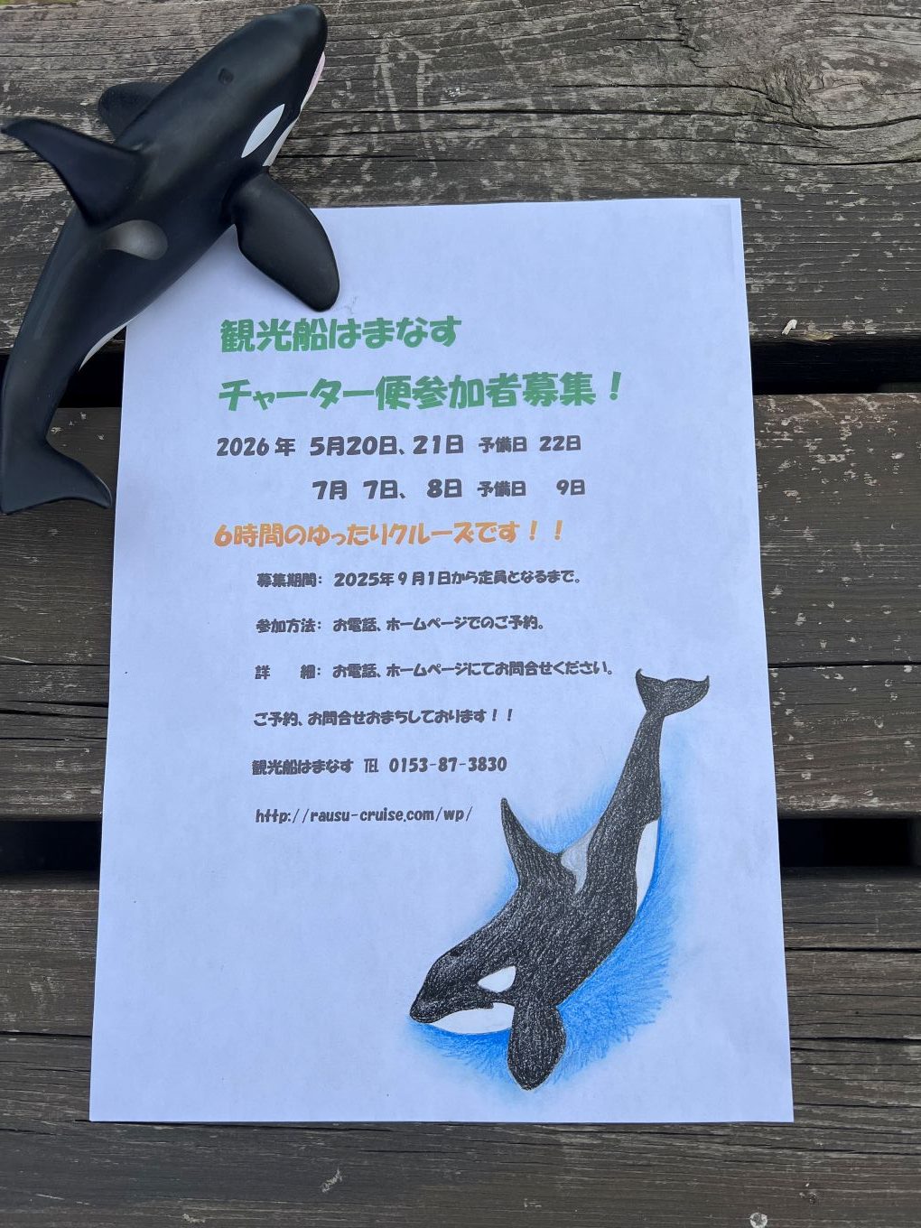 2026年7月7日、8日、9日(予備日)で募集しておりました、観光船はまなすチャーター便で2名様のキャンセルが入りましたので、